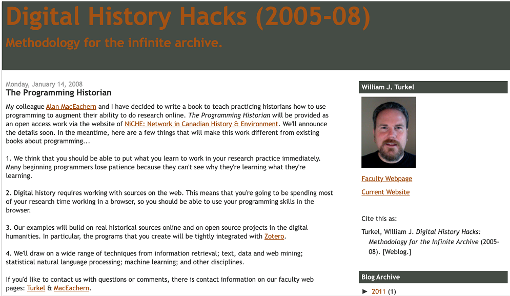 - 2012 : Programming Historian lancé en tant que journal scientifique en libre accès, évalué par des pairs, axé sur la méthodologie en humanités numériques.